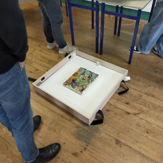 Le principe de ce dispositif est d’extraire une œuvre des collections du FRAC, de l’amener en classe dans une mallette spécialement conçue pour l’itinérance et d’établir une discussion avec un médiateur du FRAC autour de l’œuvre.